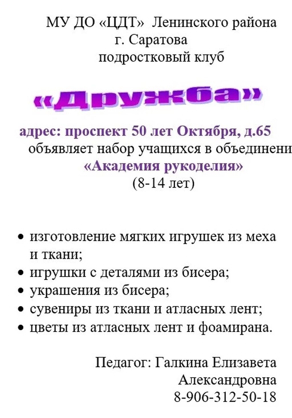 25-08-2023 Набор в объединение "Академия рукоделия" п/к "Дружба"