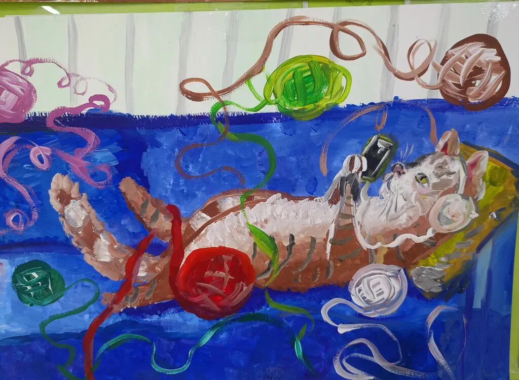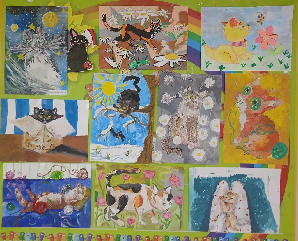 Творческие работы отличались стилем и формой исполнения (акварель, гуашь, графика). Ребята нарисовали фантазийных котиков в быту и в повседневной жизни, а также гуляющими по полянкам. Работы получились яркие и весенние.