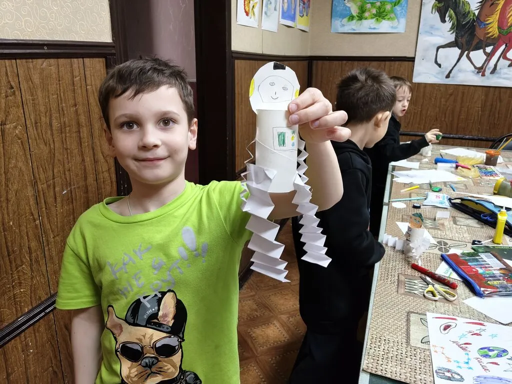 Затем педагог предложила поучаствовать в увлекательной викторине и в игре-разминке «Космодром». Далее учащиеся изготавливали поделки «Космонавт» из бумаги и картона.