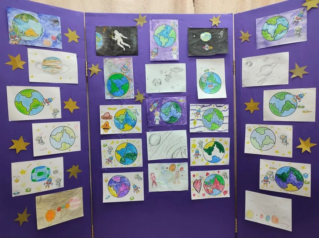 В выставке приняли участие учащиеся всех групп объединения «Ритмическая гимнастика «Импульс». Дети вместе с педагогом рисовали рисунки, делали аппликации, посвященные освоению космоса.