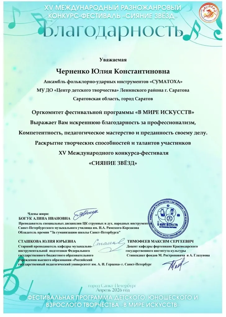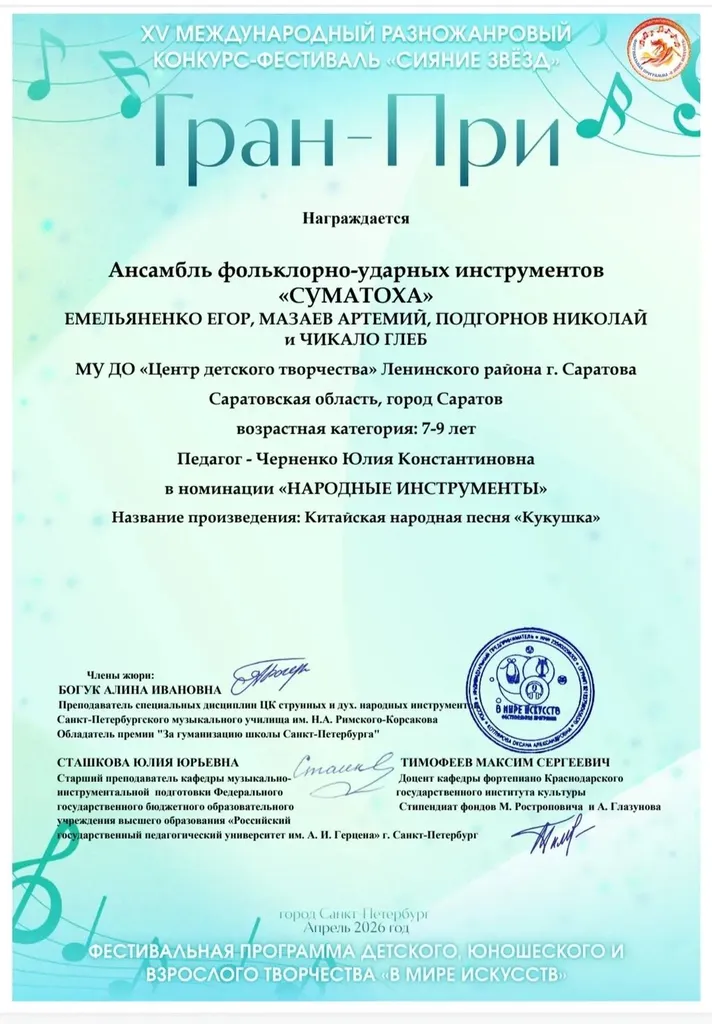 По результатам XV Международного разножанрового конкурса-фестиваля «Сияние звёзд» (заочный этап) ансамбль фольклорно-ударных инструментов «Суматоха» руководителя Черненко Юлии Константиновны стал обладателем ГРАН-ПРИ!